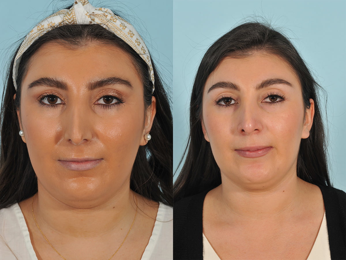Before and after liquid rhinoplasty and lower facial Kybella in 20ish female.
